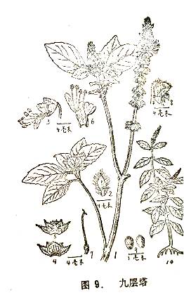识别特征:一年生芳香草本。茎直立、多分枝、 被柔毛,叶对生,卵圆形,边多有疏齿, 叶背有腺点。夏季开紫绿或淡红色小花于 每叶?下。结果长圆状,褐色。