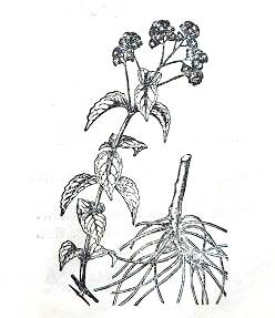 识别特征:多年生草本,茎直立,被柔毛,并 有紫色小齿。叶对生,广披针形,边有小 锯齿,背有茸毛,带有腺点,秋季开小白 花、五朵组成一个头状花序。