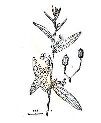 识别特征:多年生小灌木,茎枝披柔毛,单叶互生,全绿,披针形,单质背面粗糙、 叶脉突起,密被灰色星状毛。夏季开淡紫色小花,结卵状矩圆形蒴果,表靡披柔毛,形如芝麻。