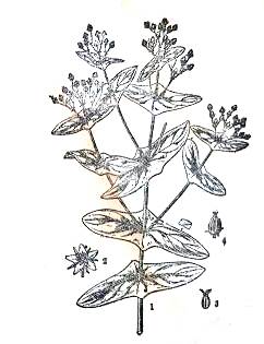 识别特征:多年生草本,茎直立,圆柱形,无毛,淡红褐色。叶对生,无柄,基部连为一体,茎贯串其中央,夏季开黄色小花。