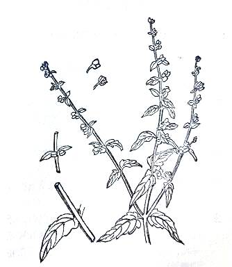 识别特征:多年生草本,茎直立,四棱形,多分枝。小叶对生,线状披针形,边有小锯齿,茎叶淡紫绿色。