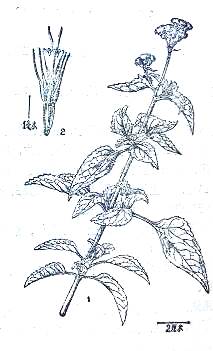 识别特征:一年生直立章本。全株披毛,有臭气,茎分枝,单叶对生或上部互生,卵形边有锯齿,全年均开白花或浅蓝色小花。