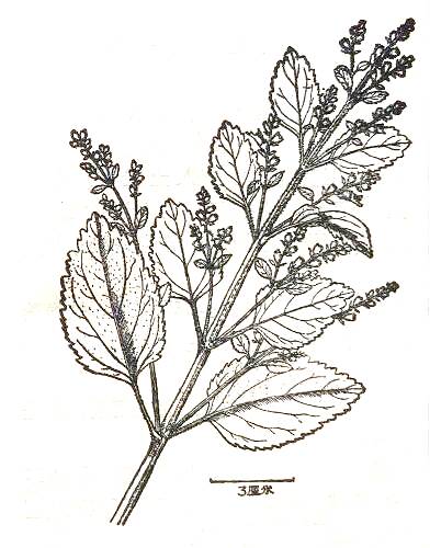 识别特征:多年生草本。茎方形直立,下部细枝伏地生根。叶对生,卵形或长?形,叶面皱拆,背脉凸起,边有锯齿。茎、叶均披柔毛,绿色或紫绿色,夏秋开淡红色唇形花。