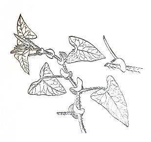 识别特征:多年生蔓生草本。茎蜿蜓、有棱线, 无毛而有钩状钝刺•叶有长柄,生倒剌, 叶片为等边三角形,盾状?生,叶背脉上有刺。夏月开淡绿色小花。结果球形,蓝黑色。