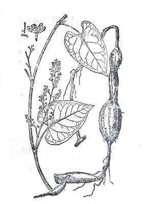 识别特征:多年生草本。有肥大黑棕色纺锤形 块状根。茎缠绕,中空,紫褐色。?分枝, 草质、单叶互生,叶片狭卵形至形,边缘细多皇波状,无毛。夏季开绿小花。