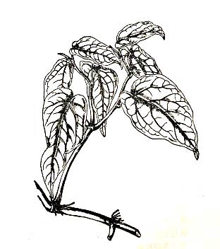 识别特征:攀援状藤本。茎枝圆柱形,有明显 膨大的节,节上有不定根。单叶互生,草质、阔卵形、全绿。春季开穗状小黄白花,球形浆果。