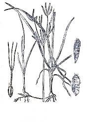 识别特征:多年生草本。地下根匐行,枝端具块状根茎,地上茎三棱,免毛。叶线形细 长而质硬,先竭尖锐,色深绿叶背有隆起中肋。夏季开深茶褐色的穗状花。