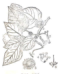 识别特征:落叶乔木,高达10米。茎、叶具乳液;嫩枝被柔毛,后脱落,叶互生;叶片卵形,长8~18厘米,宽6~12厘米,不分裂或3~5深裂,先端尖,基部圆形或心脏形,有时不对称,边缘锯齿状,上面暗绿色,具粗糙伏毛,下面灰绿色,密生柔毛;叶柄长3~10厘米,具长柔毛;托叶膜质,早落。花单性,雌雄异株;雄花为腋生?荑花序,下垂,长约5厘米,萼4裂,雄蕊4;雌花为球形头状花序,有多数棒状苞片,先端圆锥形,有毛,雌蕊散生于苞片间,花柱细长,丝状,紫色,子房筒状,为花萼所包被,呈扁圆形。聚花果肉质,成球形,直径约2厘米,橙红色。果期9月。