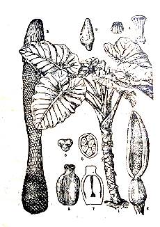 识别特征:多年生常绿草本。茎肉质,粗壮,皮黑褐色。单叶互生,阔卵艰茎部深心, 俞形夏季开黄绿色花。