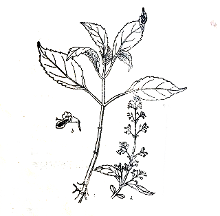 识别特征:多年生直立草本。茎直立,方形叶 对生,长椭圆形,边有粗锯齿,叶面略皱拆不平,叶脉显露,叶茎均带茶绿色,其液汁为深黄色。秋季开小白紫花。