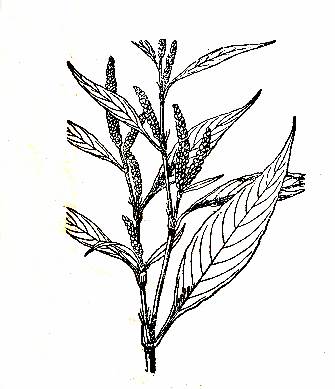 识别特征:一年生草本•揉之有辣味,茎直立或下部伏地,红褐色,节部膨大,单叶互生、披针形、边略呈波纹状,叶面中脉或有八字状黑斑,秋季开淡红色小花,穗状花序。