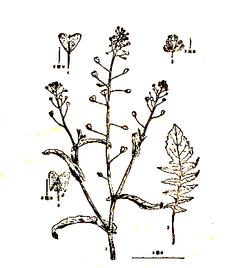 识别特征:一年或两年生草本•茎直立、多分枝、有毛、基生叶有柄、丛生、羽状深裂、裂片有锯齿;茎生叶无柄,披针形, 边有疏齿;顶生叶三角形,两面均有毛。 冬春开小白花,顶生总状花序.结三角形角果。