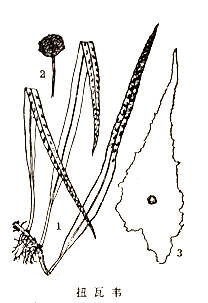 多年生草本,高不及40厘米。根状茎粗,长而横走,先端密被鳞片;鳞片卵状披针形,渐尖,褐棕色,有齿,网眼密,中心色较深。叶片线形,长15~40厘米,宽约1厘米,不被毛及鳞片,革质,灰绿色。孢子囊群大,卵圆形,幼时矩圆形,斜列,位于中肋及边缘之间,成熟时密接,幼时有盾形鳞片覆盖。5~8月连根拔起全草,洗净晒干。