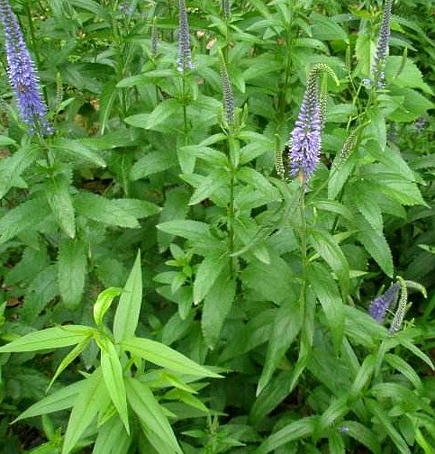 多年生草本,高50~99厘米。茎直立,茎、叶及苞片上被有细短柔毛。叶对生;倒卵状披针形至线状披针形,长2.5~6厘米,宽8~20毫米,先端短尖,基部窄狭成柄,边缘具锯齿。花密集于枝端,排列成穗形的总状花序,蓝紫色;苞片狭线状披针形至线形;花柄长1~3毫米,具短柔毛;花萼4裂,裂片卵圆形或楔形,稍有毛;花冠辐射状,花筒短,裂片4;雄蕊2,突出;子房上位,2室,花柱很长。通常花落后尚宿存果端,柱头头状。蒴果扁圆。花期9~10月。