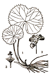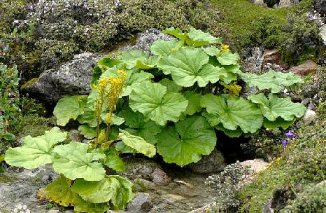 多年生草本,高60~100厘米。须根簇生,细长。基生叶扁圆形,宽12~25厘米,先端凹陷,基部心形,边缘有大小不等的粗齿;叶柄长10~25厘米,下部鞘状抱茎;茎上部的叶较小。头状花序多数,集成大聚伞状伞房花序;总苞片1列,2形,其外较狭的覆盖着内面较阔的边缘;盘花两性,全为管状花,黄色,有6枚反卷的裂瓣。瘦果倒圆锥状,有冠毛。
