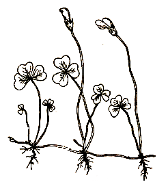 一年生草本。茎细小,匍匐,节处生根,须根上有根瘤。3出复叶,叶柄细长;叶片倒卵形,先端微凹,基部楔形,全缘;托叶2枚,阔披针形,薄膜质。花脓生,蝶形,花梗较叶柄长,有花1~2朵;苞片2~4枚,分离;萼筒钟形,裂片5;花冠紫蓝色。荚果线形,长2~2.5厘米。花果期5~9月。