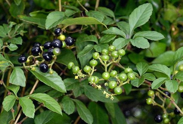 多年生?援草本。茎细长,有棱,卷须先端2裂或不分裂。 鸟趾状复叶,互生;叶柄长2〜4厘米,被柔毛;小叶5^7 枚,膜质,披针形或卵状长圆形,先端急尖或短渐尖,基部 楔形,边缘具浅波状小齿,中 间小叶较大,长4〜10厘米, 宽1.5〜3厘米,两侧小叶渐 小。花单性,雌雄异株,雄花 组成腋生、披散的圆锥花序, 长10〜16厘米;花萼短小, 5裂;花冠黄绿色,5裂,裂 片线状披针形,长2.5〜3奄 米;雄蕊5,花丝下部合生。 雌花序较短;花往3,子房球 形。浆果球形,直径5〜9亳 米,成熟时黑色。