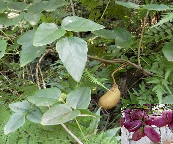 落叶或半常绿缠绕藤本,高达3米以上。枝灰色,有条纹,皮孔突起。掌状复叶,通常3~5叶簇生于枝端,或互生;叶柄细长;小叶5枚,革质,椭圆形,长3~6厘米,宽1.5~2.6厘米,先端圆而微凹,并具一细短尖,基部宽楔形或圆形,全缘,下面稍呈粉白色。花雌雄同株,总状花序腋生,长约10厘米;花紫色;雌花1~2朵生于花序下部,苞片线状披针形,花被3,宽椭圆形,钝头,退化雄蕊6,雌蕊6,圆筒状,子房1室,柱头头状;雄花密生于花序上部,较小,具小苞片,花被3,雄蕊6,花丝扁,花药2室,退化雌蕊3或4.菁荚状浆果,长筒形,两端圆,长达8厘米,宽达3厘米,成热时紫色,沿腹缝线开裂。种子黑色,甚多,卵状长方形,稍扁,有光泽。花期4~6月。果热期8月。