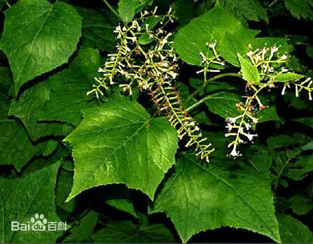 直立草本。茎高50〜70厘米,绿色,少分枝。叶互生,有 长柄,叶片阔卵形,长9〜10厘米,5浅裂,裂片先端尖,边 缘有细锯齿,上面绿色,下 面淡绿色,两面疏被短毛。圆锥花序,长约30厘米,小头状花序甚多;总苞片 1列,外具小苞片;花全部 管状,先端5裂。瘦果红 褐色,有棱约10条,冠毛白色,与苞片约等长。
