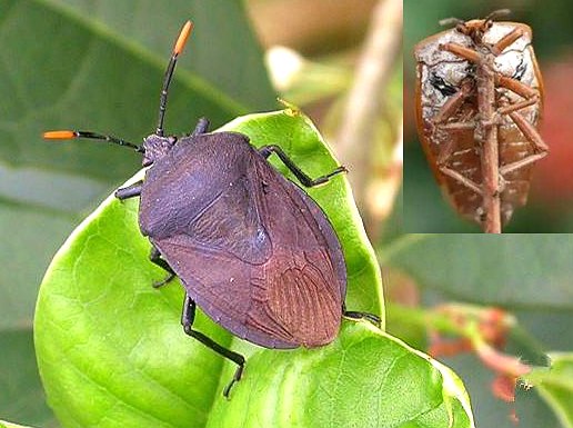 全体椭圆形,长1.7~2.2厘米,宽1~1.2厘米,体一般紫黑色,带铜色光泽,头部、前胸背板及小盾片较黑。头小,略呈三角形;复眼突出,呈卵圆形,位于近基部两侧;单眼1对,橙黄色;喙较短,触角6节,第1节较粗,圆筒形,其余4节较细长而扁,第2节长于第3节。前胸背板前狭后阔,前缘凹进,后缘略拱出,中部横直,侧角显著;表面密布细刻点,并杂有黑皱纹,前方两侧各有1相当大的眉形区,色泽幽暗,仅中部具刻点。小盾片大。翅2对,前翅为半鞘翅,棕红色,翅末1.3为膜质,纵脉很密。足3对,后足最长,跗节3节。腹面密布细刻及皱纹,后胸腹板近前缘区有2个臭孔,位于后足基前外侧,能由此放出臭气。雄虫第9节为生殖节,其端缘弧形,中央尤为弓凸。