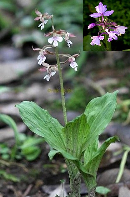 ②三棱虾脊兰与上种相似,但花数较少,仅约10朵左右,花朵较大,紫绿色,距长于花被裂片。