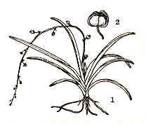 多年生草本。叶基出,线形,长20〜30厘米,宽约0.3〜 0.6厘米,有一条明 显的中脉,基部扩大 抱茎,膜质,半透明。总状花序从叶丛抽 出,长于叶;花小,长 3〜5毫米,淡紫色,有 柄,花被6裂;雄弓 6;子房无柄,3室,每 室有胚珠多颗。蒴果 三角状,直径G〜8毫 米,开裂,有种子3或 三角草2粒。种子圆形,直径 1.植物全形2.果实2〜3亳米。
