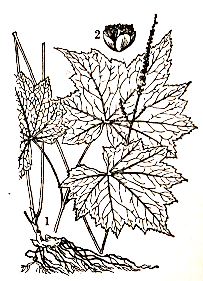 多年生草本。根茎横走,具多数须根。茎直立,中空,有纵沟,高25~110厘米,上部密生灰色短柔毛。叶1~2片,近基生,1回3出复叶,具长柄;小叶有柄,卵状心形,中央小叶长5~20厘米,宽4~18厘米,7~9掌状浅裂,边缘有锯齿;侧生小叶较小。穗状花序细长,长10~25厘米,单一或分枝;花小,白色,直径4毫米,近无梗;萼片4~5;雄蕊8~多数;心皮1~2,无毛。菁荚果长约10毫米,具多数浅褐色种子。花期7~8月。
