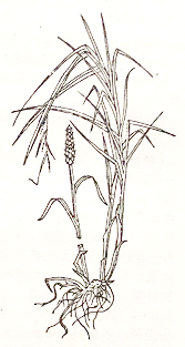 多年生草本。根茎短,横生。秆簇生,高20~60厘米,三棱形。叶片线形,常与秆等长,宽约6毫米;有叶鞘。花单性,雌雄同株;花序通常长10~15厘米;小穗3~10,雄性小穗顶生,稍纤弱,长2~5厘米;雌性小穗侧生,圆柱形,长2.5~5厘米;鳞片覆瓦状排列,雌花的鳞片卵形,淡褐色,有脉3条,脊延伸成一长尖头;雄蕊3;花柱2裂;囊苞卵形,有短喙,褐色。小坚果淡褐色,三棱形。抽穗期夏秋。