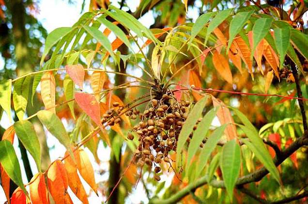 落叶乔木,高达20米。树皮幼时灰白色,平滑,者则深灰色,粗糙,成不规则之纵裂。幼枝有柔毛,后渐脱落。冬芽生枝顶。单数羽状复叶,螺旋状互生,长22~75厘米;叶柄长5~9厘米,基部膨大;小叶11~15,卵形或长方状卵形,长7~15厘米,宽3~7厘米,先端长尖,基部广楔形或不整齐圆形,全缘;上面无毛或中脉生微毛,下面初有细毛,老时沿脉密生淡褐色毛;小叶柄短。花单性或两性;雌雄异株或杂生;花序圆锥状,腋生;花梗具短柔毛;花密而小,黄绿色;雄花花萼5,长圆形,花瓣5,长方状卵形,有紫纹,雄蕊5,着生于花盘边缘,花丝短,具退化子房;雌花雄蕊较小,子房1室,花柱短,柱头3裂。果序下垂,核果扁圆,直径6~8毫米,黄色。花期5~6月。果熟期11月。