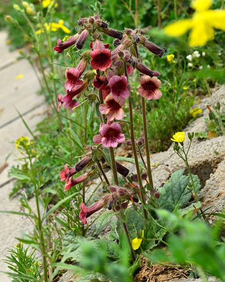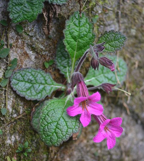 多年生草本,高10~40厘米,全株被灰白色长柔毛及腺毛。根茎肥厚、肉质。呈块状、圆柱形或纺锤形。茎直立,单一或由基部分生数枝。根生叶丛生;叶片倒卵形或长椭圆形,长3~10厘米,宽1.5~4厘米,先端钝,基部渐狭,下延成长叶柄,边缘有不整齐钝齿,叶面多皱;茎生叶较根生叶为小。花多毛,于茎上部排列成总状花序;花萼钟形,长约1.5厘米,先端5裂,裂片三角形,略不整齐;花冠宽阔,筒状,稍弯曲,长3~4厘米,紫红色或淡紫红色,有时呈淡黄色,先端5浅裂,略呈2唇状,裂片先端近于截形;雄蕊4,2强,着生冠管的近基部处;子房上位,卵形,2室,花柱单一,柱头膨大。蒴果卵形或卵圆形,先端尖,上有宿存花柱,外有宿存花萼。种子多数。花期4~5月。果期5~6月。