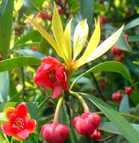 常绿灌木或小乔木,高可达7米。树干灰色,幼枝绿色。单叶互生,革质,椭圆状披针形或长方披针形,长11~17厘米,宽2.5~5厘米,先端尖尾状或锐尖,基部楔形,全缘,叶面深绿色,背面浅绿色;柄长2厘米。花腋生,花梗长2~3厘米,基部具小苞片1对;萼片3,三角状卵形,较小,淡绿色常带红色;花瓣红色,阔卵形或长方卵形,共有18瓣,数轮,愈在内者形愈小;雄蕊多数;心皮多数,一般为8~13个。??果星芒状排列,木质,紫棕色,先端喙状突出,微上曲,星状体径约2.5~3厘米。种子肾形,坚硬有光泽,黄色或橄榄棕色。花期5月。果熟期9月。