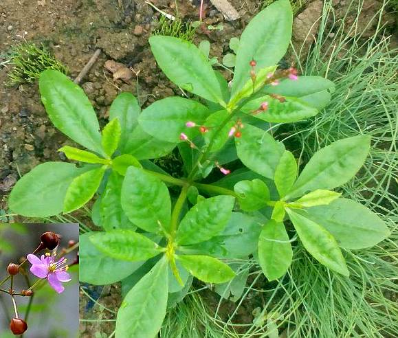 一年生草本,高可达60厘米左右,肉质,全体无毛。主根粗壮有分枝,外表棕褐色。茎圆柱形,下部有分枝,基部稍木质化。叶互生:倒卵形,或倒卵状长椭圆形,长6~7厘米,宽2.5~3.5厘米,先端尖或钝圆,全缘,基部渐次狭窄而成短柄,两面绿色而光滑。茎顶分枝成长圆锥状的花丛,总花柄呈紫绿或暗绿色;花小多数,淡紫红色,直径约6毫米,花柄纤长;萼片2,卵圆形,头尖,早落;花瓣5,倒卵形或椭圆形;雄蕊10余枚,花丝细柔;雌蕊子房球形,花柱线形,柱头3深裂,先端向外展而微弯。蒴果,熟时灰褐色,直径约3毫米。种子细小,黑色,扁圆形。花期6~7月。果期9~10月。