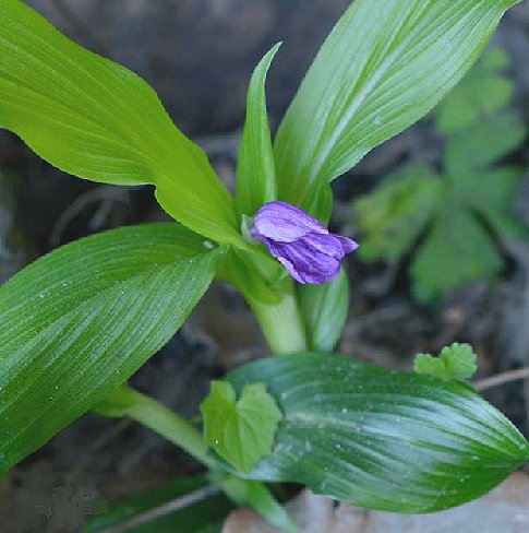 多年生草本,高10~20厘米。有粗壮肉质的根茎,5~6枚簇生,呈纺锤形,黄白色。单叶互生,嵌迭着生,基部相抱而成简状,叶片披针形,长6~9厘米,宽0.9~1.4厘米,先端渐狭,顶处尖或稍钝,全缘,平行细脉。花1~2朵顶生,深紫红色;花冠管长而纤细,裂片3,上裂片阔,直立,风帽状,侧面2裂片较短;唇瓣大,楔形,下弯;侧生假雄蕊2枚,倒披针形,花瓣状;雄蕊1枚,花药弯曲,花药基部有距。蒴果圆柱状。花期春夏。