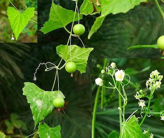 多年生柔弱草质藤本,长60~150厘米,有不分枝的卷须。叶互生,多型,长4~16厘米,由狭三角状披针形至阔三角状卵形或卵状矩圆形,有角或分裂成3~5裂,基部1对裂片常向下延伸而成各种形状,扩展或彼此稍交迭,基部阔心形或狭心形或戟形,上面极粗糙而有小白点,纸质。花单性,白色,雌雄同株;雄花为具柄的伞房花序,花柄秃净或略被小毛,萼管短,萼齿5,花冠5深裂,雄蕊3枚,花药分离。雌花单生,花萼、花冠与雄花酎,子房矩圆形,花柱3枚。果实纺锤形,长1.8~4厘米,热时红色。种子倒卵形,稍扁。花期夏月。