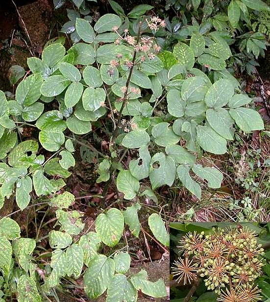 多年生草本,高1~2米。根茎粗壮,横生,根茎下方散生多数圆柱形的根。茎有纵沟纹,分枝多,老枝近于无毛,幼枝疏生短柔毛。叶互生,2~3回羽状复叶,长达30~40厘米,有托叶;小叶有柄,长1~8厘米,顶端的小叶柄比较长;小叶片9B形或心脏形,长4~12厘米,宽2~9厘米,先端渐尖,基部圆形或肾形,边缘有锯齿或重锯齿,两面疏生短柔毛。圆锥状复伞形花序顶生或腋生,总花梗长4.6~11厘米,被有短柔毛;总苞片或小苞片有或无;每一小伞形花序有花约20~35朵;花萼杯形,先端5齿裂,裂片三角形;花瓣6。白色或淡黄色,卵形,先端稍尖;雄蕊5,花丝甚短;子房下位,花柱长约为雄蕊的一半,柱头5裂。浆果圆球状,长2~3毫米。种子6粒。花期7叫月。果期9~10月。