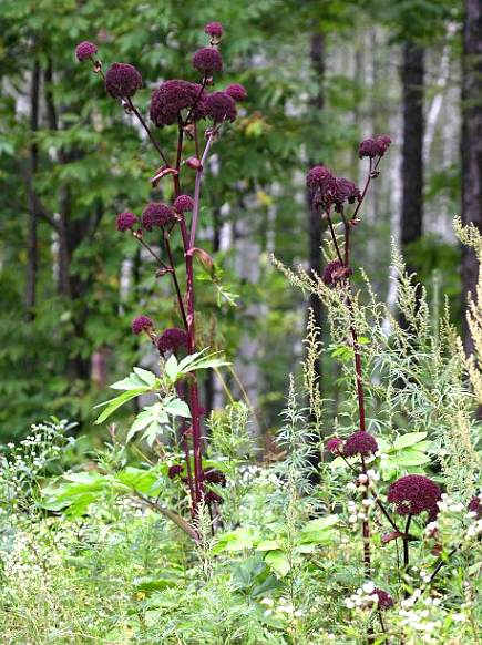 多年生草本,高1〜2米,全株常带黑紫色•茎有沟,中 空,分枝少。叶薄革 质,2〜3回羽状分 裂,裂片长圆状披 针形,长可达20厘 米,宽可达6厘米,边缘有不整齐的锯 齿。复伞形花序黑 紫色,无总苞,外包 以膨大成气泡状的 黑紫色叶鞘,伞梗 30—70个,密生短 毛;小总荀线形;花 瓣黑紫色,先端呈 凹头状内曲。分果 长约8毫米,宽约5毫米,每棱槽中具1条油管。