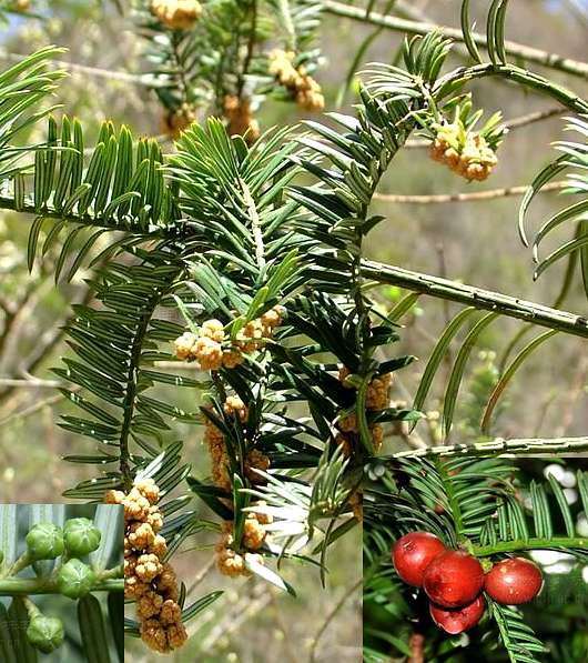 常绿小乔木,高2~5米,有时可达15米。叶螺旋状着生,2列;线形,通常直,稀微弯,长2~5厘米,宽3~4毫米,先端微急尖或有短尖头,基部近圆形或宽楔形,近无柄,下面具2条白色气孔带。雄球花6~7数聚生成头状,径约6毫米,梗长约3毫米;每雄球花基部有1苞片,雄蕊4~11,花丝短,通常具3花药;雌球花通常2~6个胚珠发育成种子。种子椭圆状卵形、卵圆形或近圆形,长1.8~2.5厘米,外种皮带紫色。花期3~4月。种子翌年10月成熟。