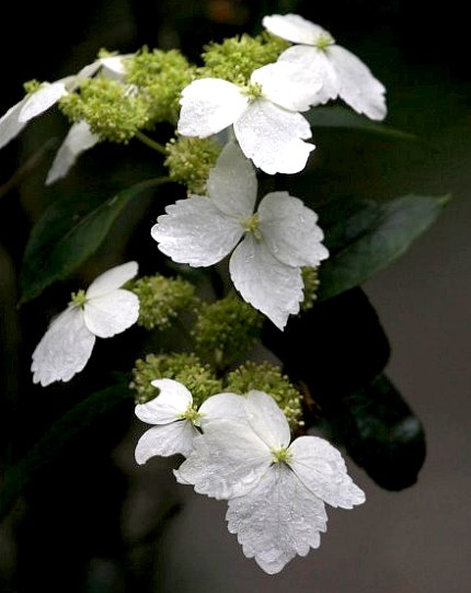 灌木,高2~3米。小枝圆柱状,或稍呈四棱形,被有白色平贴硬毛,老时灰褐色。单叶对生,披针形、椭圆状披针形或例卵形,长8~20厘米,宽2~3厘米,渐尖,边缘具细锯齿,基部楔形或圆形,上面绿色,下面灰色,两面均具平贴硬毛。聚伞花序顶生,花梗密被平贴硬毛;花异型;外缘为不育花,萼片4,花瓣状,白色或紫色,阔卵圆形,顶端有锯齿,径约2~4厘米;中央为孕性花,白色,萼筒与子房合生,被稀疏平贴硬毛,萼裂三角形,花瓣5,长方卵形,镊合状排列,雌蕊1,子房下位,花柱2,柱头头状。蒴果半球状,顶端截平,长约3毫米,有棱脊、种子细小,两端有翅,黄褐色。花期8月。果期9月。