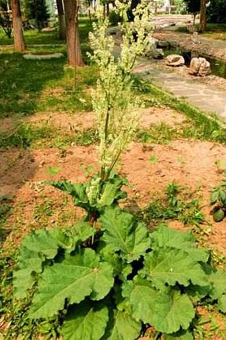 多年生高大草本,高2米左右,与上种相似。茎无毛或有毛。根生叶略呈圆形或宽心形,直径40~70厘米,3~7掌状深裂,裂片狭长,常再作羽状浅裂,先端锐尖,基部心形;茎生叶较小,柄亦较短。圆锥花序大形,幼时多呈浓紫色,亦有绿白色者,分枝紧密,小枝挺直向上;花小,具较长花梗;花被6,2轮;雄蕊一般9枚;子房三角形,花柱3。瘦果三角形,有翅,顶端圆或微凹,基部心形。花期6~7月。果期7~9月。