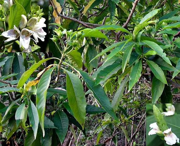 大灌木,高2~3米,除幼嫩部稍被毛外,余均秃净。叶对生,矩圆状披针形或矩圆状椭圆形,长10~15厘米,宽3~6厘米,先端渐尖,基部短尖,全缘,两面均被微毛;具短柄,穗状花序顶生或近顶部腋生,常数个合生,连花序柄长约10厘米;苞片卵形或倒卵形,长约1.5厘米,宽8~10毫米,被微毛;小苞片矩圆形,长1.2~1.4厘米,宽约3毫米;萼长约8毫米,裂片披针形;花冠白色而有紫色线条,长约3厘米,2唇形,上唇2裂或近全缘,下唇3裂;雄蕊2,突出;花柱线形,短2裂。蒴果长约2厘米,被毛,有种子4颗。花期春、夏。