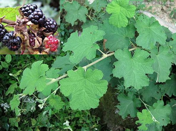 落叶灌木。高2~5米。茎圆柱形,无刺,密被灰褐色茸毛,有时混生刚毛。单叶,近圃形或宽卵形,直径6~17厘米,先端急尖或圆钝,基部心形,边缘有不整齐锯齿,常有不明显的5~7裂,上面粗糙,下面灰绿色,网脉明显,有短绒毛;叶柄长5~7厘米;托叶较宽,近似卵圆形,基部不对称,顶端浅裂,有早落现象。圆锥花序顶生或成腋生花丛;总花梗和花梗密生绒毛;花紫色,直径1~1.5厘米;萼裂片三角状卵形,先端尾尖,内外两面有茸毛;花瓣倒卵圆形;雄蕊多数。聚合果近球形,直径6~8毫米,黑色。花期6~7月。果期8~9月。