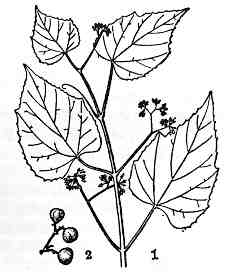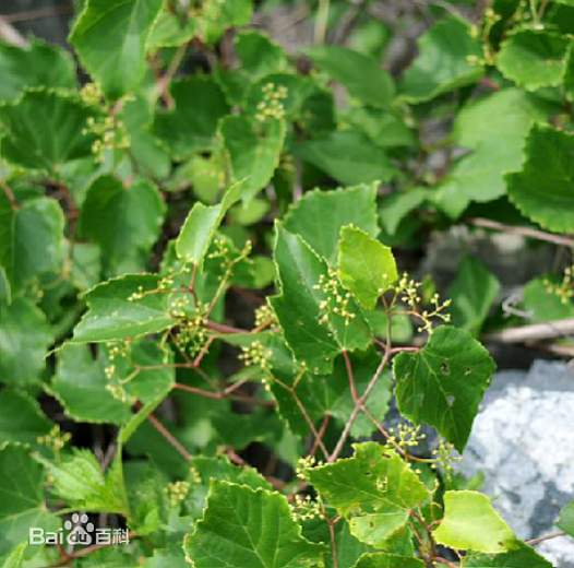 落叶木质藤本,长可达6米。幼时紫色,小枝无毛。单叶互生,三角状卵形或三角状宽卵形,长5~10厘米,3浅裂或不裂,先端渐尖,基部心形,边缘具疏浅圆锯齿,上面幼时深绿色被绢毛,下面灰绿色。聚伞花序较密集,具长柄,与叶对生或顶生,花4~5朵;萼片连合;花瓣扩展;雄蕊短;子房2室。浆果深蓝色或紫色。花期5~6月。果期10月。