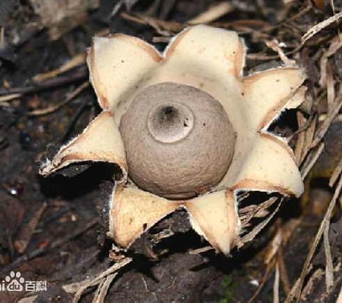 子实体初发生时呈球状,外皮褐色,质厚而强初,富吸湿 性,3层,外层薄,松软,中层纤维质,内层脆骨质,成熟后, 裂成6〜10余片,湿润时舒展而向下反 卷,直立地上,状如星芒,干燥时向内卷 缩,甚刚硬,内侧具深裂痕;内皮球形,质 薄,直径1.2〜2.8厘米,灰色至褐色,顶 端有1孔,孢子由此散出》孢子浓茶褐 色,球形,表面有微细的疣状突起。