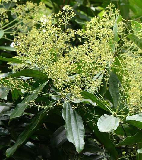 常绿乔木,高达15米,树皮褐色,有香味。枝常对生,近于四棱形,有短柔毛,但毛不久即脱落。叶较大,近对生,硬革质,椭圆状长椭圆形至卵状长椭圆形,长10~22厘米,宽4~6厘米,先瑞圆或渐狭,基部宽楔形,全缘,上面榄绿色,下面淡绿色,光亮无毛,3出脉,其间有横向平行细脉;叶柄粗壮,带褐色,长1.2~2厘米。花黄色;圆锥花序大,近顶生,短于或与叶等长。果小,椭圆形或长椭圆形,长约1厘米,顶端圆而有细尖;果托浅杯状,包着果的基部,边缘有圆齿6枚。花期春季。果期4~5月。