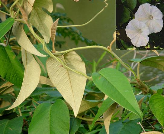 藤本。叶互生,全缘,卵圆形或阔椭圆形,长12~17厘米,宽8~13.5厘米,下面密生白色绢毛。花簇生,为苞片所包,有总花梗,生1~4束花;花冠漏斗状,白色;雄蕊5,内藏;子房4室,柱头2,头状。