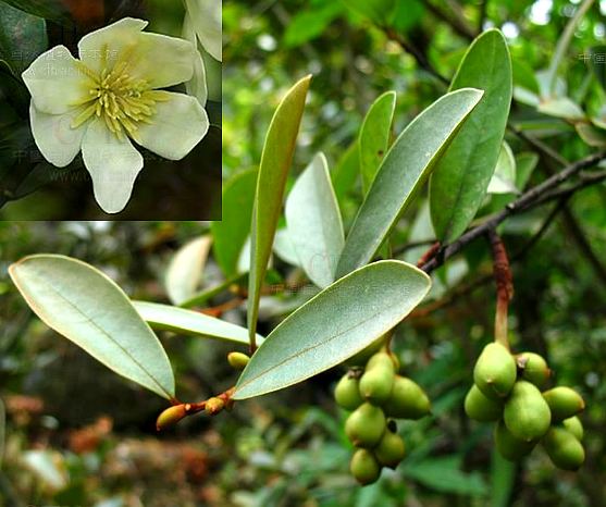 常绿灌木,高2~4米。幼枝密生锈色绒毛。叶互生,革质,卵形至倒卵状椭圆形,长4~8厚米,宽1.5~3厘米,先端急尖或钝圆,基部楔形,全缘,上面黄绿色,无毛,下面有棕色茸毛,后渐脱落,中脉在下面凸起;叶柄长4~5毫米。花单生于叶腋,芳香;花芽被棕褐色茸毛;花梗短;花被片6,白色,倒卵形,排成2轮;雄蕊多数,长1厘米;聚合果短;甚?褐色;种子1~2,有假种皮,成熟时悬挂于丝状的种柄上而不脱落。花期春季。