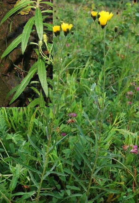 多年生草本,高60〜90厘米。基生叶线状长椭圆形,长 约30厘米,宽1.5〜2厘米,全缘,先端渐尖,基部下延至叶柄,呈?状;花茎上的叶 互生,无柄,狭披针形或 ^线形。头状花序由花茎 顶端叶腋抽出,具长梗, 数个排列成伞房状;每 一头状花序的总苞长约 1.3厘米,圆柱状,苞片 长披针形,先端尖,背面 有黑色条纹;花序内全 为舌状花,有10余朵,花 冠黄色,舌片先端截平, 有五齿裂。瘦果长圆形, 顶端有淡褐色的冠毛。 花期9月。