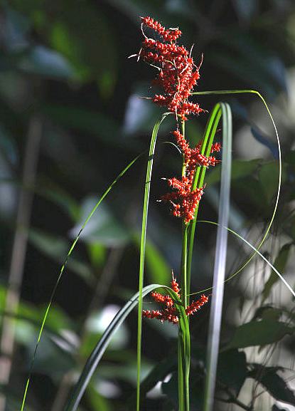 多年生秃净草本。根茎横走。茎三棱形。叶线形,长30~50厘米,先端长尖,叶鞘秃净。苞片呈叶状,线形,褐色;穗状花序多数,密集形成顶生圆锥花序式;鳞片淡褐色,卵形,覆瓦状排列;雄蕊3;囊苞卵形,有短喙,红色。小坚果卵状三棱形,棕红色,包在宿存的囊苞内。花期春夏。