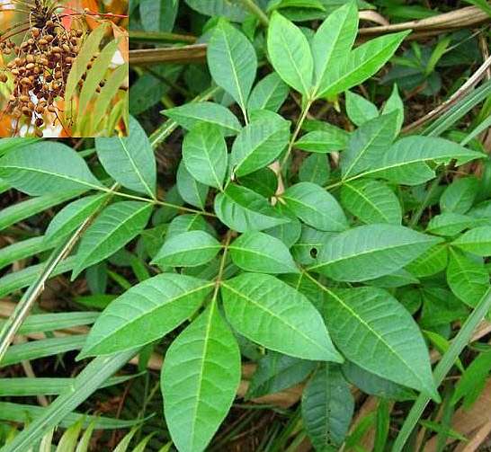 灌木,高1~4米。小枝红褐色,无毛。单数羽状复叶互生;小叶5~7,纸质,卵形至卵状矩圆形,长3~5厘米,宽1.5~3厘米,先端急尖或渐尖,基部斜楔形或近圆形,全缘,两面均无毛。圆锥花序腋生,花小而稀疏,杂性;萼片和花瓣4~6,覆瓦状排列;子房无柄,1室,花柱30核果扁圆形,黄白色至黄绿色;种子1颗。