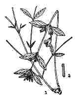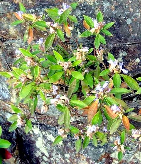 多年生苹本,高 20-45厘米。茎丛生,方形,有节,茎、叶密被 倒生短毛或长绵毛。叶对生,有短柄;叶片捕圆形,长2.5-4 厘米,宽1〜2厘米,两端尖,全缘。花腋生,有总苞片4枚,每苞内有花2朵,花蓝色;萼5片;花冠筒上部膨大,5裂。